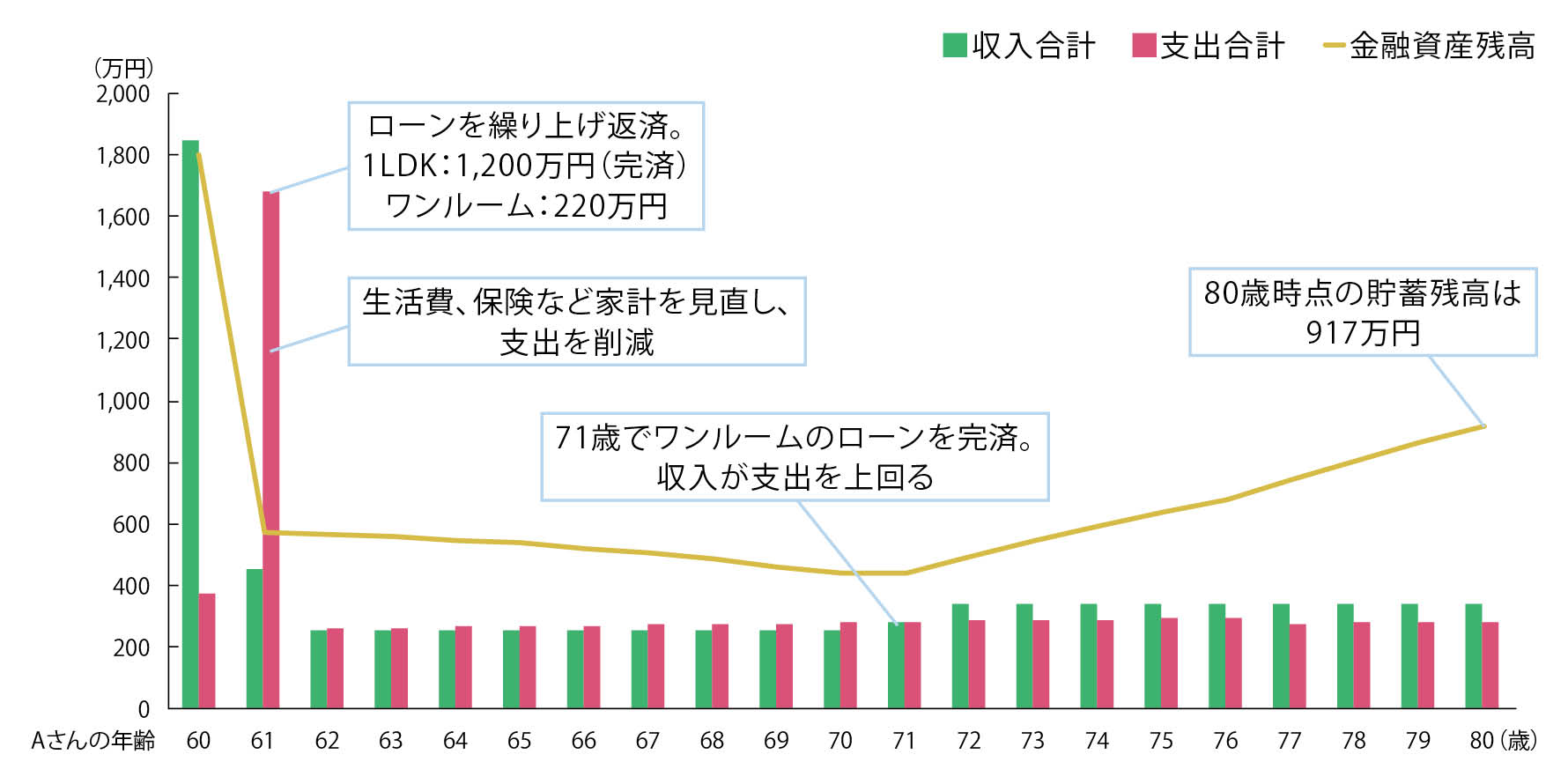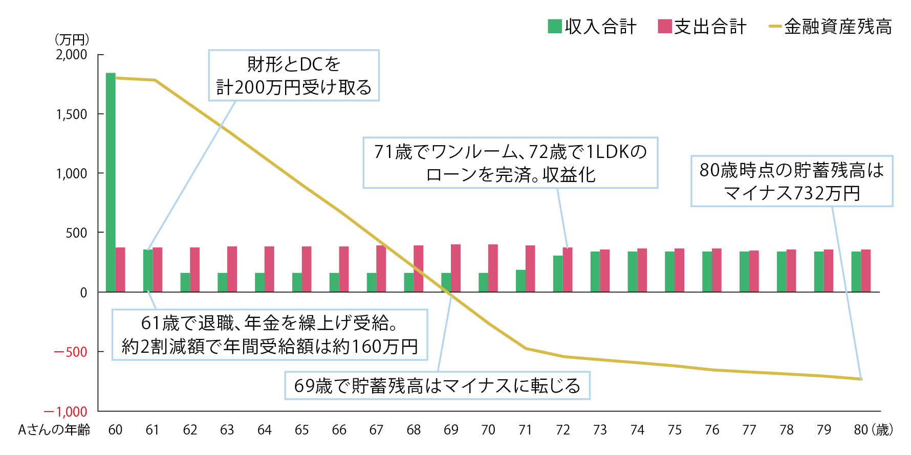 退職後の収入は公的年金160万円で、そこから生活費や不動産投資の赤字補填をすると、年間収支はかなりの赤字になります。しばらくは貯蓄(退職金を含む)を取り崩して生活できますが、69歳で貯蓄はマイナスに転じます。71歳でワンルーム、72歳で1LDKのローンを完済したあとも年間収支はマイナスで、80歳時点で700万円以上の不足が見込まれます。