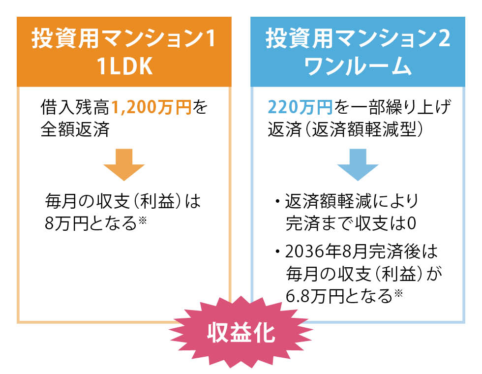 1LDKの借入残高約1,200万円を全額繰り上げ返済します。年間120万円の返済が不要になり、管理費等を差し引いて毎月8万円・年96万円の収益を得ることができます。
