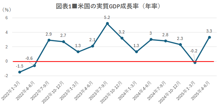 米国経済は、2025年4-6月期の実質GDP成長率が前期比年率で3.3%と強い成長を示していました。ただし、2025年1-3月期がマイナス成長(-0.2%)だった反動によって高く見えていると考えられます(図表1)。
