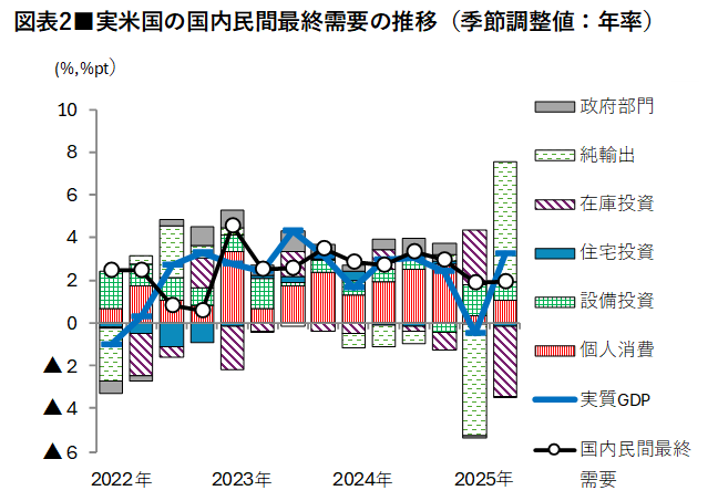 より実体経済に近い、米国の個人消費と設備投資、住宅投資の合計である「国内民間最終需要」は鈍化しています(図表2)。