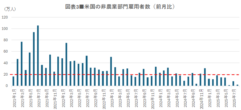 また、景気の好不調を見極める重要な指標である「非農業部門雇用者数」の増加ペースも急速に落ちており、2025年8月はわずか2.2万人の増加と、好景気の目安とされる15万~20万人を大きく下回っています(図表3)。これらの指標から、米国の景気が減速していることは明らかです。