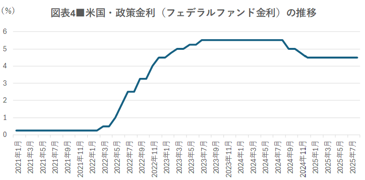 景気が減速した要因は大きく2つあります。 1つ目は金融引き締めの効果です。米国では2022年3月から利上げが始まり、政策金利(フェデラル・ファンド金利:FF金利)は2023年7月に5.5%まで引き上げられました。その後、2024年9月から引き締めを弱め、2025年9月16日時点では4.25%まで下がっています(図表4)。