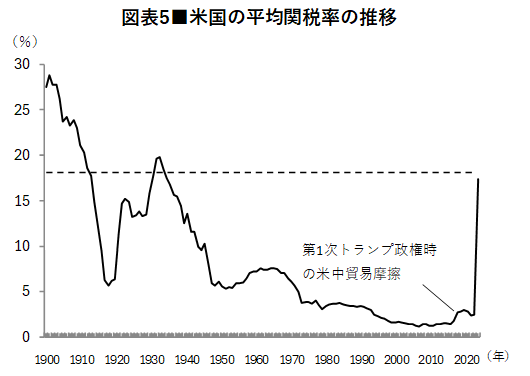 トランプ関税によって、米国の平均関税率は、それまでの2.5%程度から、17%強まで上昇する見込みです(図表5)。これは1930年代以来の歴史的な水準です。これにより消費者物価が1%程度押し上げられるという試算もあります。