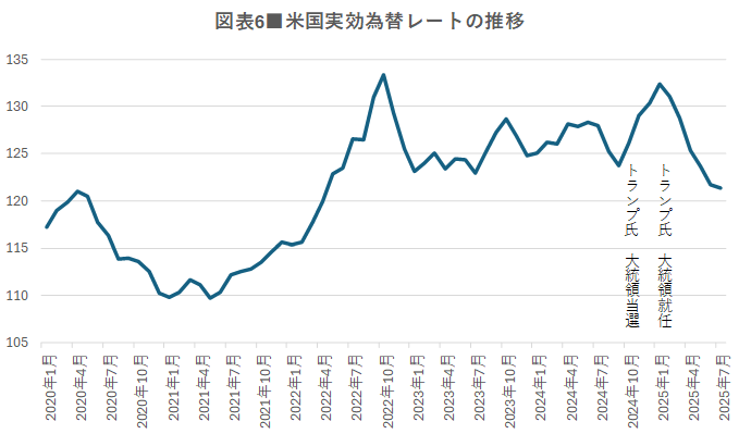 中でも気になるのが米国の実効為替レートの動きです。実効為替レートとは、ある国の通貨が複数の通貨に対し、総合的に見て高いか安いかを示す、いわば通貨の実力を測る指標です。2024年11月のトランプ氏の大統領当選から2025年1月の就任までの間に、米国の実効為替レートは大きく上昇し、その後急落しました(図表6)。短期間にこれほど実効為替レートが上下することはめったにありません。