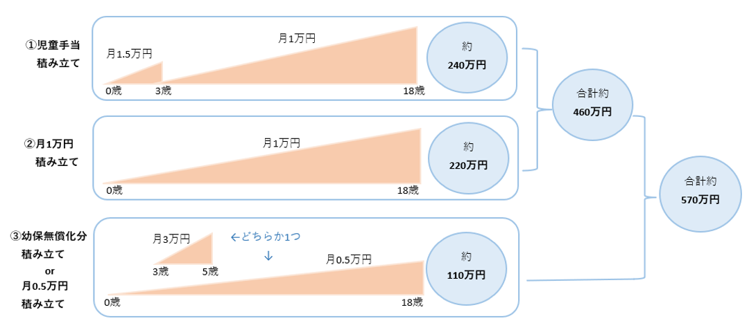 私立大学理系の資金を用意したい場合は、①児童手当と②月1万円に加えて、③の積み立てを追加します。保育料が発生していた人は、幼保無償化分で浮いた費用を積み立てます。仮に、無償化で浮いた保育料分月3万円を3年間積み立てたら、合計約110万円貯まります。または、0~18歳までの18年間、月0.5万円を積み立てても約110万円貯まります。①と②と③の合計額で約570万円を用意でき、私立大学理系分になりますね。
