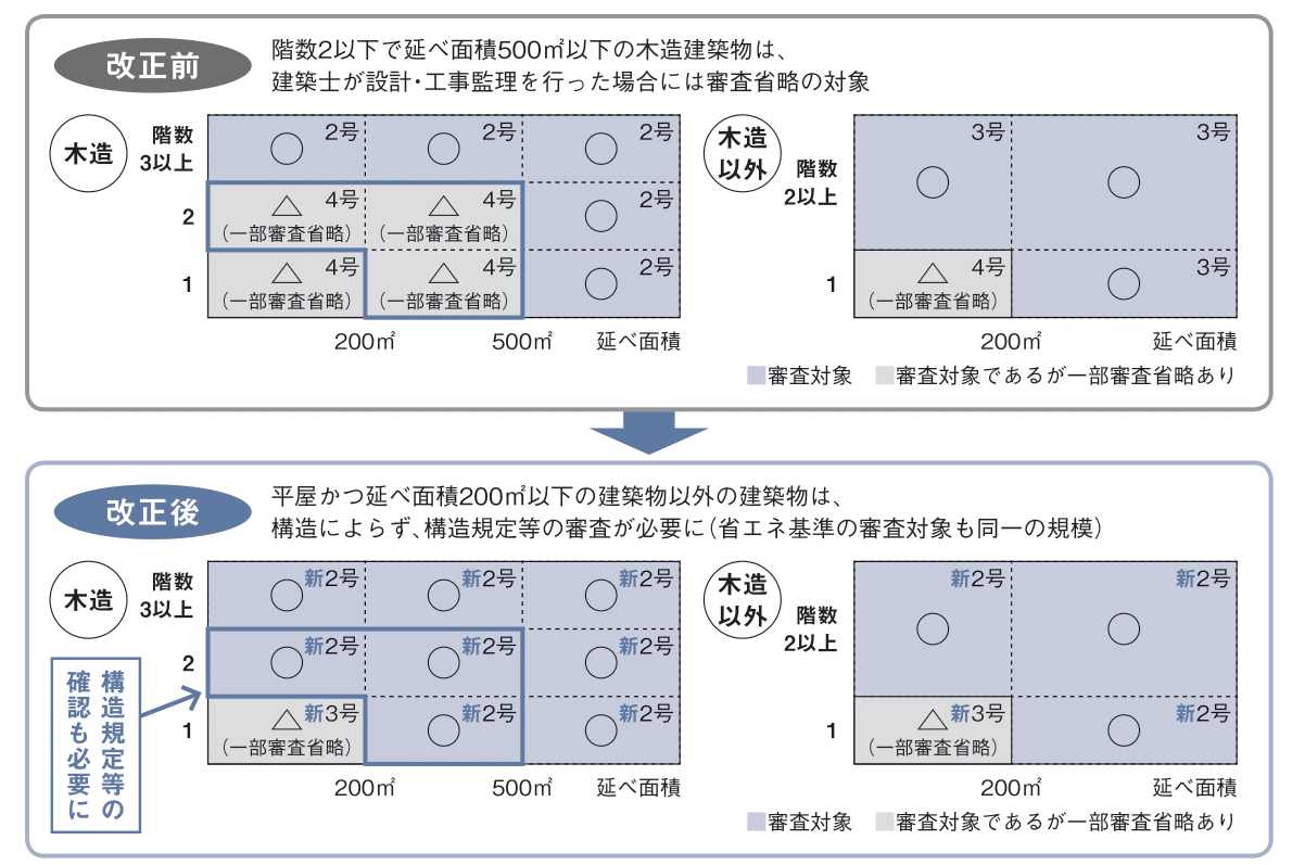 法改正後は、木造2階建て住宅や延べ面積200平方メートルを超える平屋建て住宅などは従来の「4号建築物」ではなく「新2号建築物」に区分され、構造審査が必須となりました(図表2)。これにより、「これまで審査が不要だった木造2階建て住宅のほとんどが構造審査の対象になった」ということです。審査の手間や期間、コストは増えますが、第三者の厳しい目で構造安全性がチェックされることになり、住宅の信頼性は格段に向上します。