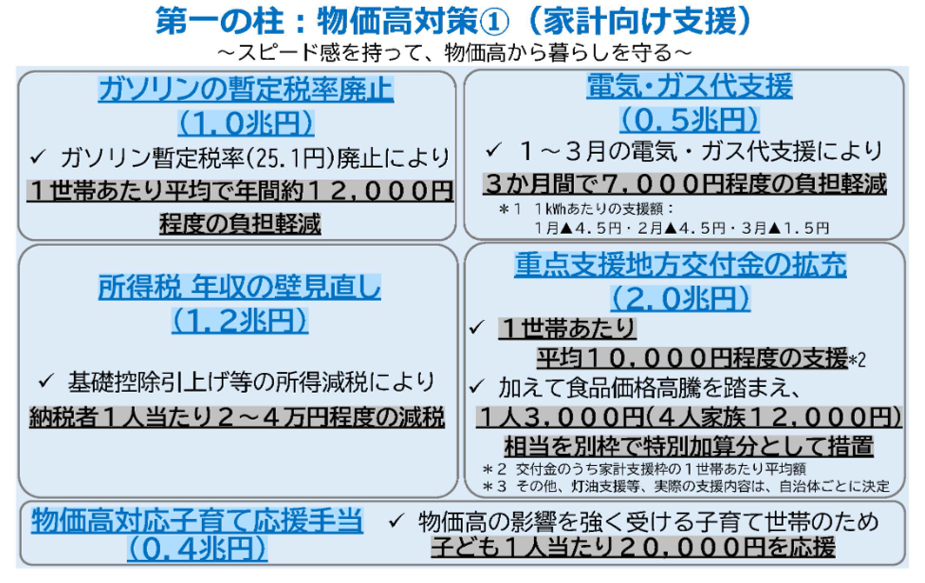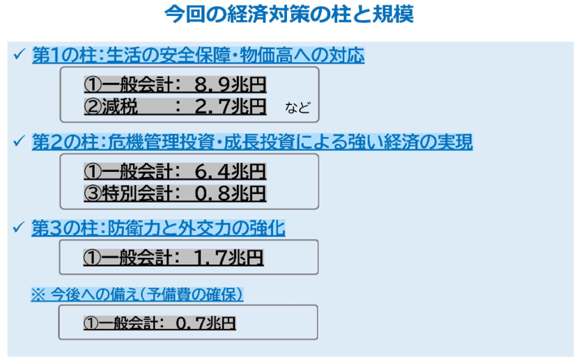 日本独自の好材料もあります。その一つが冒頭で触れた経済対策です。今回の経済対策は、“真水”と呼ばれる国費などの規模が21.3兆円程度(一般会計の歳出17.7兆円程度、減税2.7兆円程度、特別会計0.8兆円程度)にのぼるものです。その第1の柱に物価高への対応が掲げられています(図表1)。