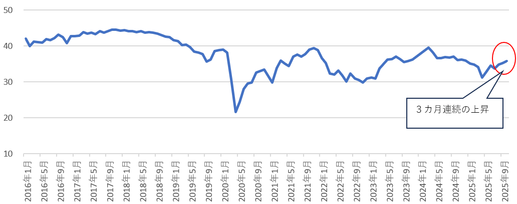 例えば、内閣府の「消費動向調査」(2025年10月実施分)では、消費者態度指数が3カ月連続で上昇しており、「10月の消費マインドは、持ち直している」とされています(図表3)。