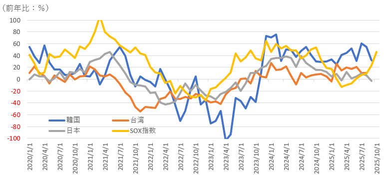 第1回でも触れましたが、私はSOX指数に加えて日本、台湾、韓国の半導体の出荷・在庫バランスにも注目しています(図表5)。半導体産業の在庫調整の状況を示す経済指標の1つで、「出荷の前年同月比増減」から「在庫の前年同月比増減」を差し引いて計算されます。