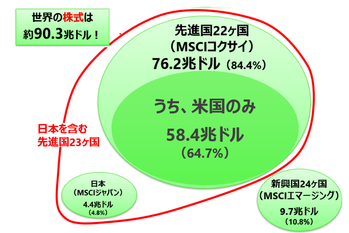 直近(2025年9月30日時点)のファクトシートによると、構成国ごとの株式時価総額比率は日本を除く先進国が約85%でそのうち約65%は米国です。日本が約5%ですから、世界の株式時価総額は先進国だけで約90%を占めていることになります(図表2)。