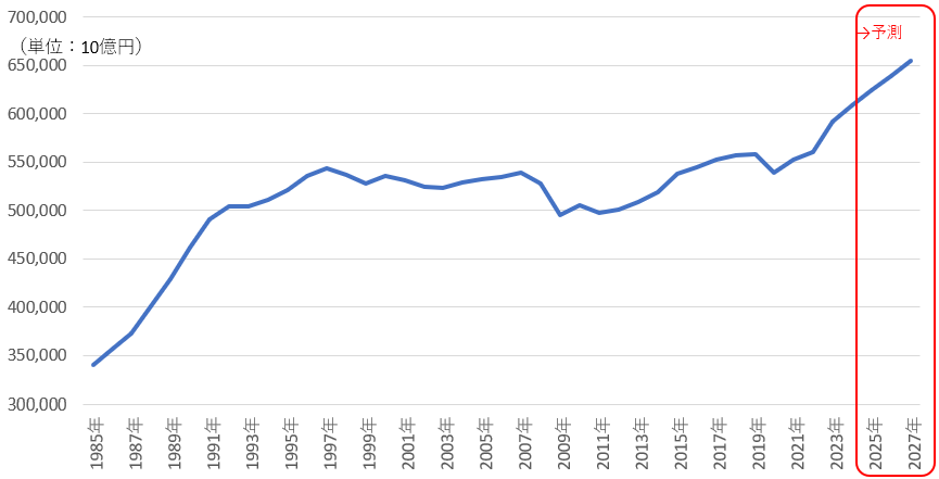 「失われた30年」の間、米国や中国など他の国々では拡大していた名目GDPの規模が、日本ではほとんど伸びていませんでした(図表2)。ですが、近年、日本でも名目GDPが拡大しつつあります(図表3)。最大の理由はインフレ経済になってきているという点です。