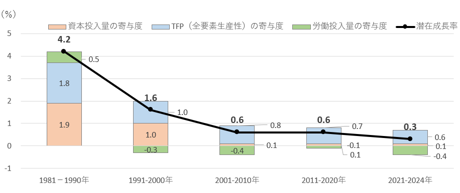 90年代後半以降、日本では潜在成長率が鈍化しています(図表4)。潜在成長率はその国の経済の供給力を示すとされますが、これは労働投入量(就業者数×労働時間)のほかに、資本投入量と全要素生産性(TFP)によって決まります。