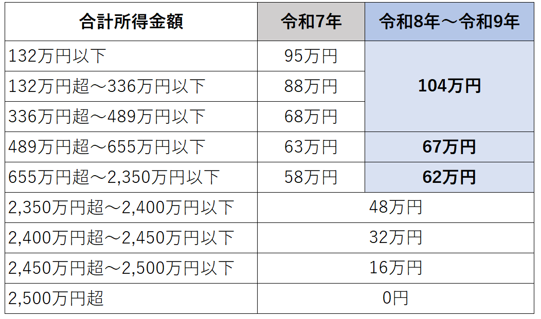 合計所得金額が2,350万円以下の場合、2026(令和8)年・2027(令和9)年は本則として控除額が4万円引き上げられます。加えて特例により基礎控除の上乗せ部分があり、2段階の引き上げをふまえた所得税の基礎控除は図表1のようになります。