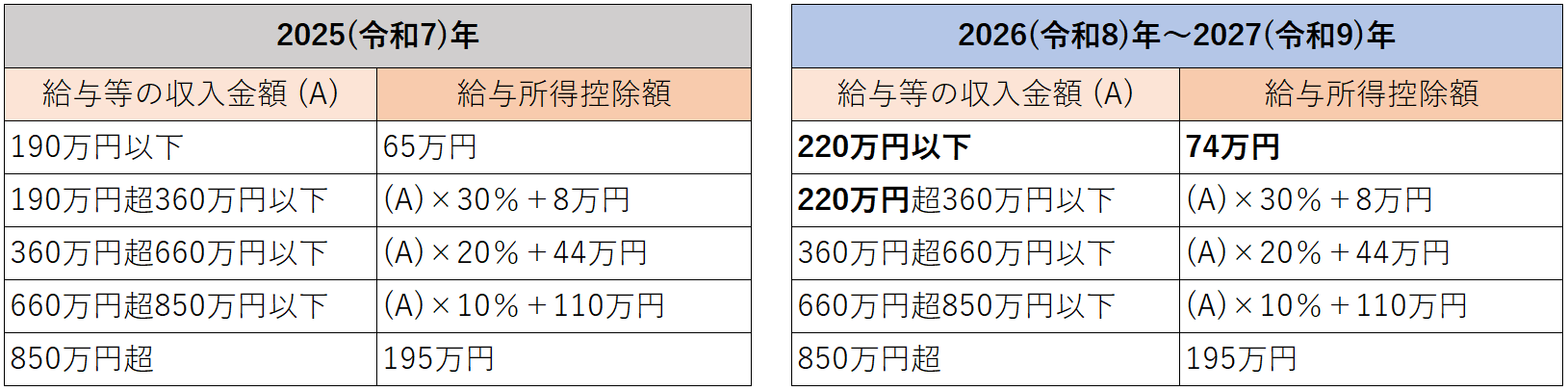 給与所得控除の最低保障額65万円も基礎控除と同様、物価上昇に連動する仕組みにより4万円引き上げられて69万円となります。さらに2026(令和8)年と2027(令和9)年においては最低保障額を5万円上乗せする特例があり、2段階の引き上げによって給与所得控除は次のとおり最低保障額が74万円となります(図表2)。