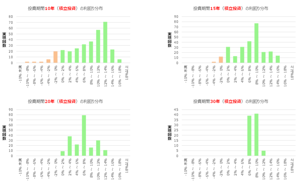 具体的に、積立投資の利回り分布をグラフ化したものが(図表1)です。これを見ると、積立投資であっても投資期間が10年だと325回のうち32回はマイナスとなり、約10%は元本割れです。しかし20年を超えるとマイナスになることはなく、30年になるとさらに安定してすべての期間で利回りが6%以上となります。