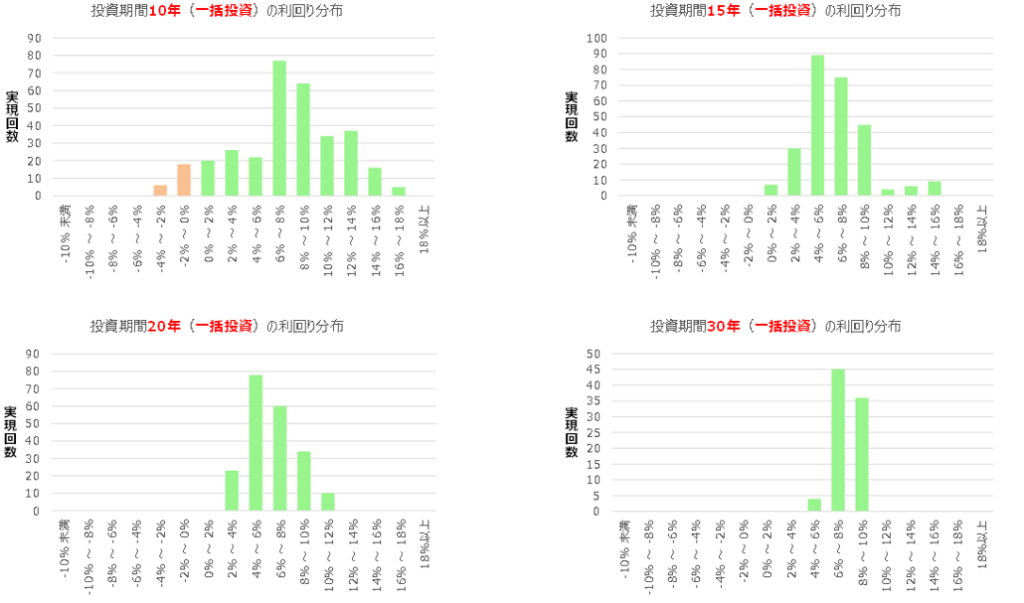 一般的に、積立投資はタイミングを見極める必要がなく、時間を分散することによってドル・コスト平均法で購入単価を平準化し、リスクを抑えられることから資産形成の王道といわれます。では、一括投資やキャッチアップ投資と比較した場合、リスクやリターンにどのような違いがあるのでしょうか。投資方法ごとに、期間別の利回りの実現回数を確認していきます。