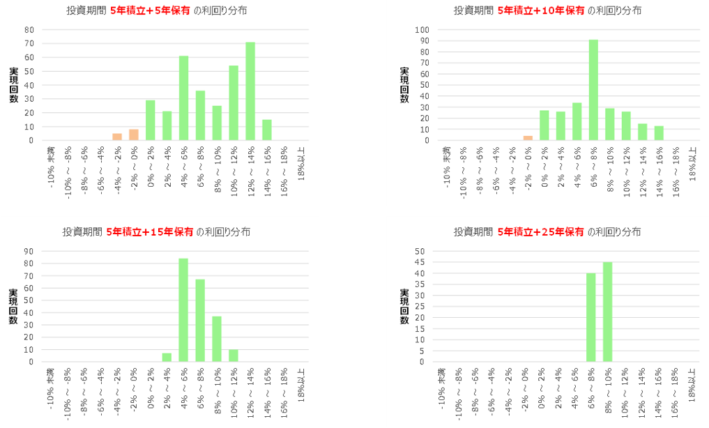前項までの分析結果から、投資方法によるリターンの違いを比較していきます。すでにお気づきかもしれませんが、利回り分布図を投資期間ごとに比較すると、グラフの形は投資方法による大きな違いはありません。