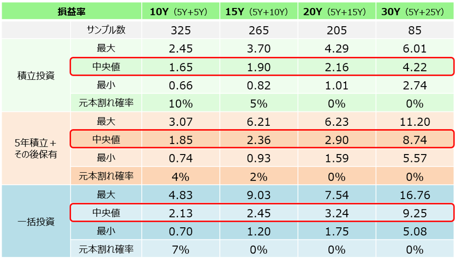 では投資方法ごとに、各期間における損益率(=評価額/累計投資金額)についても見ていきましょう。投資元本に対してその期間で何倍になっているかを見る損益率は、タイミングによって大きくブレるのは事実です。ただし、投資期間が長くなれば損益率は安定しやすいため、最終的に損失となる可能性は低くなるのがセオリーです。
