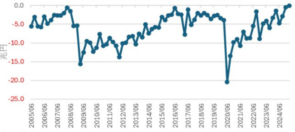 日本の財政収支は過去30年で最も改善しています。日本の財政状況を日銀の資金循環統計でみると、一般政府の資金過不足は急速に改善し、2024年度末時点で資金不足はほぼ解消されつつあります(図表1)。