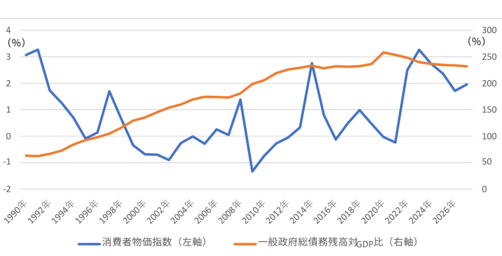 消費者物価指数と一般政府総債務残高対GDPの推移をみると、消費者物価指数が下がるタイミングで一般政府総債務残高対GDP比が上昇し、消費者物価指数が上がり始めたタイミングで一般政府総債務残高対GDPが改善していることがわかります(図表4)。