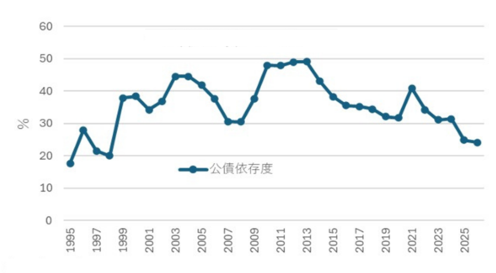 2026年度予算案では、公債依存度(一般会計歳入総額のうち、国債の発行によって資金調達する金額の割合)が24%台まで低下しており、数字上でも「借金依存からの脱却」を確認することができます(図表3)。