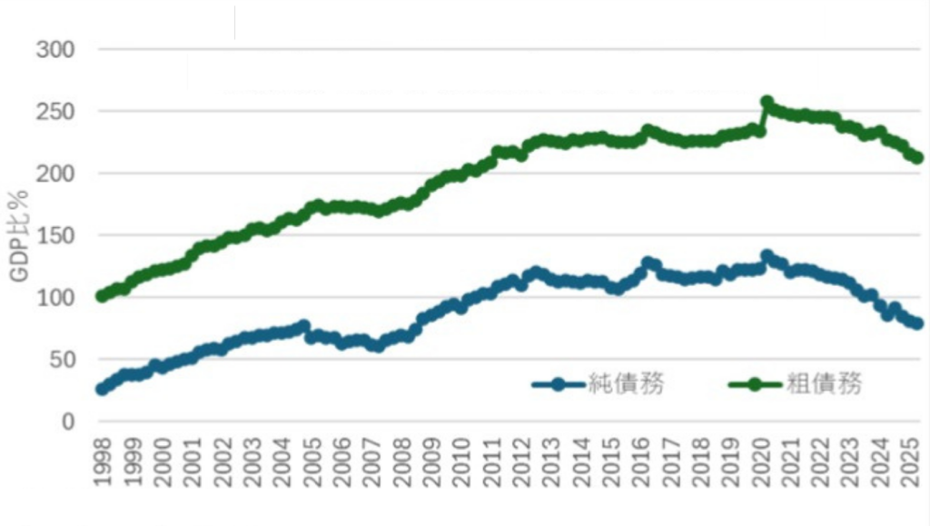 財政状況の改善はストック面からもわかります。ストックの財政状況を政府債務残高対GDP比でみると、2020年をピークに急速に低下しています。図表2では、政府「純」債務残高対GDP比も示しています。