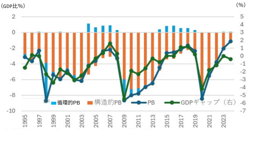 しかし、インフレが定着した2023年以降のPBは、その国の経済全体の総需要と潜在的な供給力の乖離を示すGDPギャップ(需給ギャップ)に対して、改善しすぎてしまっています(図表5)。これは税金を取りすぎていることを示しています。