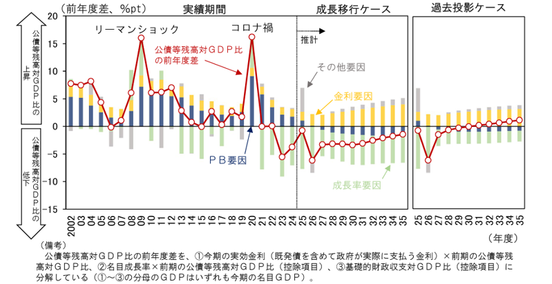 内閣府が2026年1月に公表した「中長期の経済財政に関する試算」に、「債務残高対GDP比の変化要因」というグラフが掲載されています(図表6)。