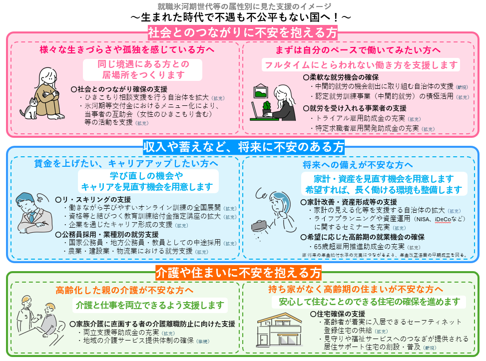 2025年6月には「新たな就職氷河期世代等支援プログラムの基本的な枠組み」が閣議決定されました。これにより、①就労・処遇改善に向けた支援②社会参加に向けた段階的支援③高齢期を見据えた支援の3本柱で、社会参加と活躍をさらに後押しする方針が定められました。これまでの就労支援に加え、40代・50代となった対象者のライフステージに合わせ、将来の生活設計までを見据えた包括的なサポートへと進化しています。具体的な支援策は図の通りです。