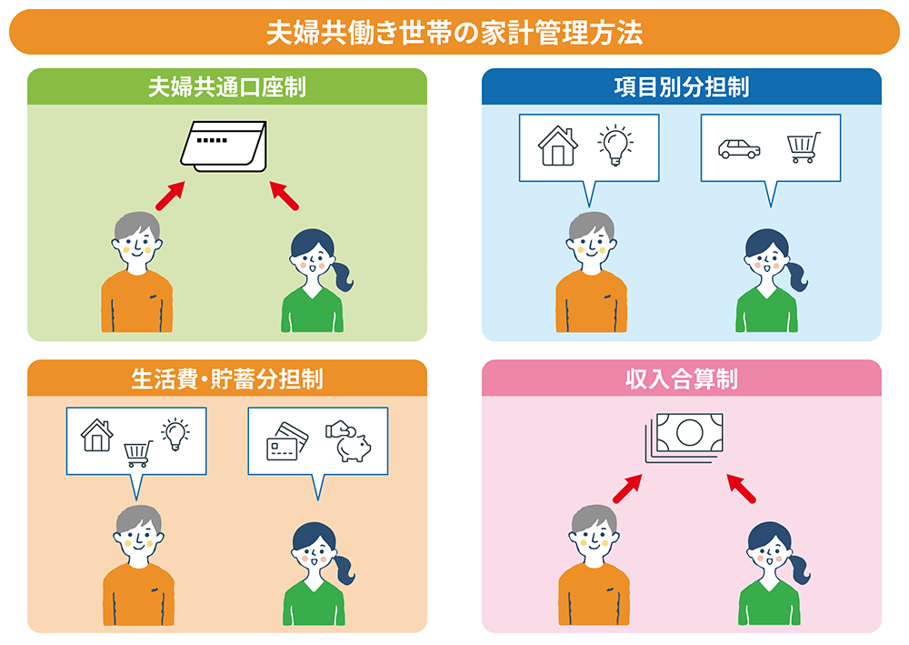 共働き夫婦の家計管理方法はさまざまです。例えば共通の口座に夫婦それぞれが毎月定額を入金して生活費を支払う方法、生活費の項目ごとに支払う担当を決める方法などがあります。