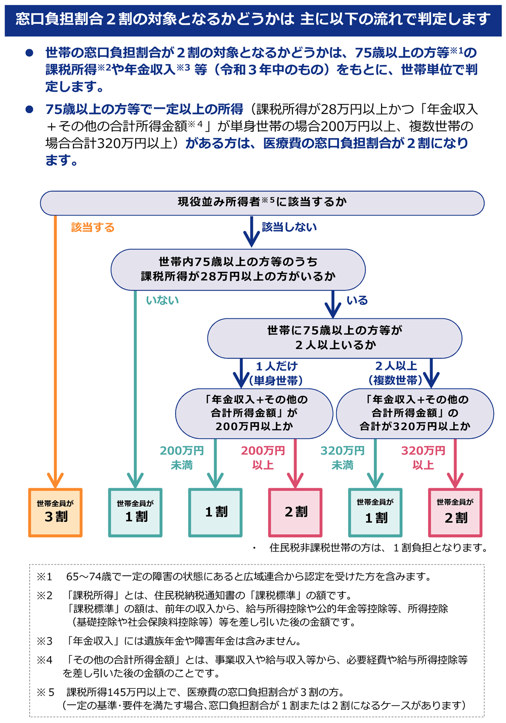 2022年10月に医療保険制度における給付と負担が見直され、一定以上の所得がある後期高齢者(75歳以上の方等)の窓口負担割合が従来の1割から2割に増えました。具体的には課税所得が28万円以上かつ「年金収入+その他の合計所得金額」が単身世帯の場合200万円以上、複数世帯の場合、合計320万円以上の人は窓口負担割合が2割となっています。