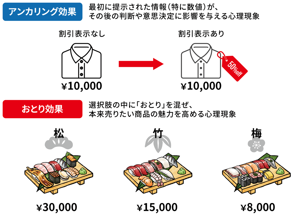 買い物で「お得」と感じる背景には、販売側が工夫を凝らした様々な戦略があります。これによって消費者の購買意欲が刺激され、購入へとつながります。中でもよく使われるのが「アンカリング効果」と「おとり効果」です。