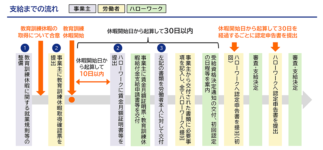 申請は、教育訓練休暇取得について事業主の承認を得たうえで、所定の申請書類をハローワークへ提出します。申請から支給までの流れは以下の通りです。