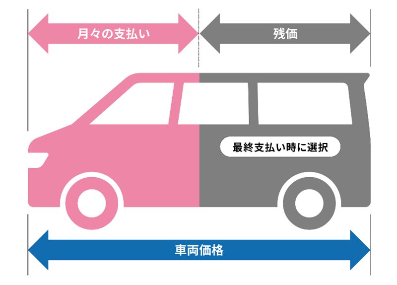 残クレとは、車両の購入金額から将来の査定価格(残価)を差し引いた金額を分割で支払う方法です。例えば車両価格600万円、5年後の残価300万円と設定された場合、差額の300万円を分割して支払うため、一般的なローンよりも月々の支払額を抑えられます。契約満了時には「新車に乗り換える」「車を返却する」「残価を支払って乗り続ける(一括払いまたは再クレジット)」のいずれかを選択します。