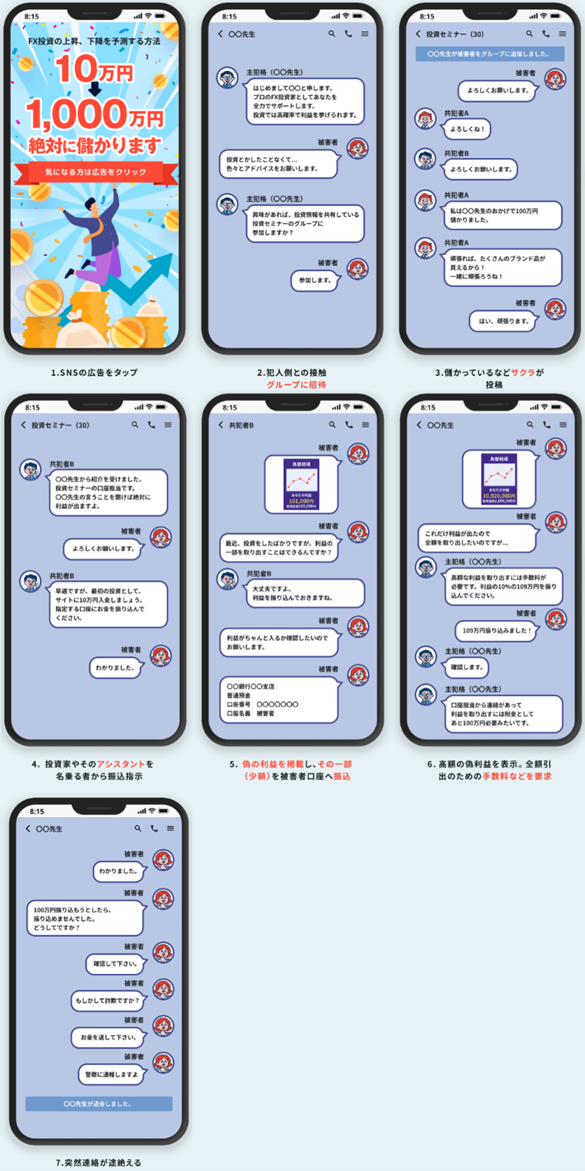 SNS型詐欺の傾向として、YouTubeなど動画配信サービスの「バナー等広告」が接点になりやすいことが挙げられます。例えばSNS型投資詐欺の場合、「投資家」を名乗る人物が登場し、投資によって大きな利益が出たことをアピールします。そして、LINEグループに誘導する流れが定石です。