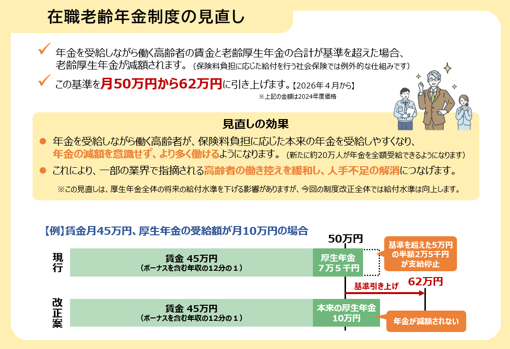 特に注目したいのが、在職老齢年金制度の見直しです。賃金(総報酬月額相当額)と老齢厚生年金月額の合計が月62万円以内であれば、年金の減額を意識せずに働けるようになりました。