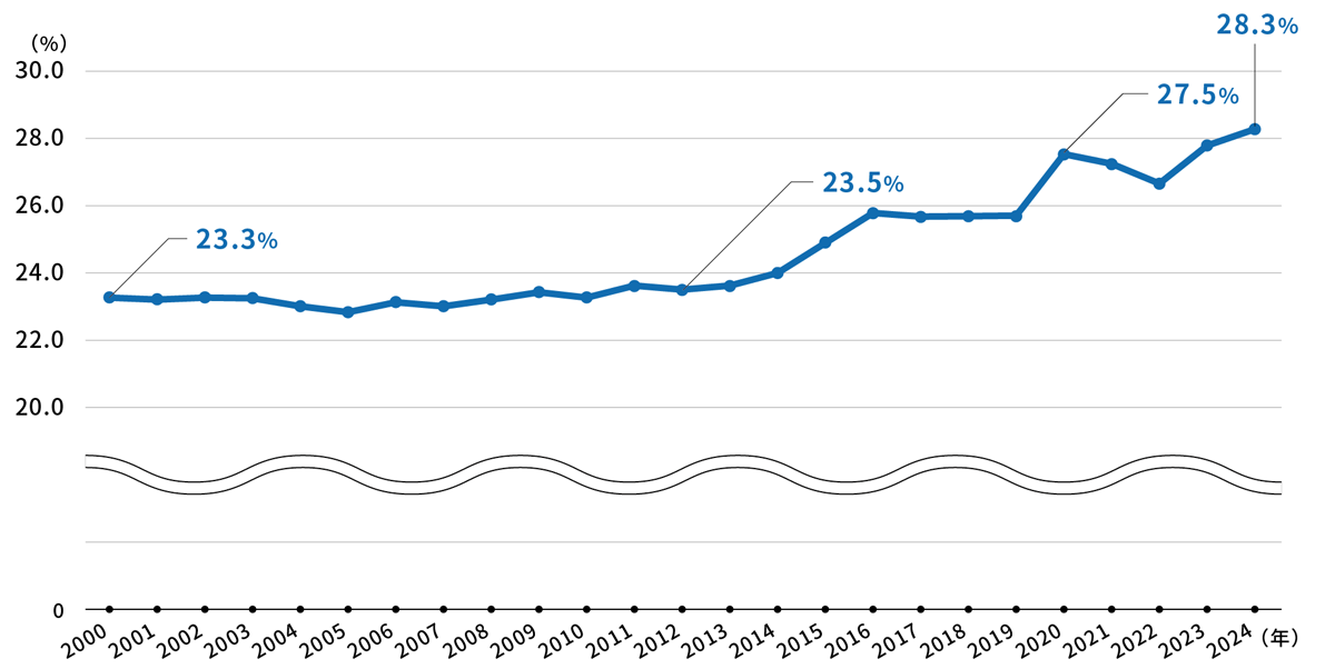 2024年の総務省の家計調査(二人以上の世帯)によれば、2000年~2012年までのエンゲル係数は23%前後の横ばいでした。2013年以降は緩やかな上昇傾向が続き、2020年以降は30%に近づきつつあり、上昇局面を迎えています。