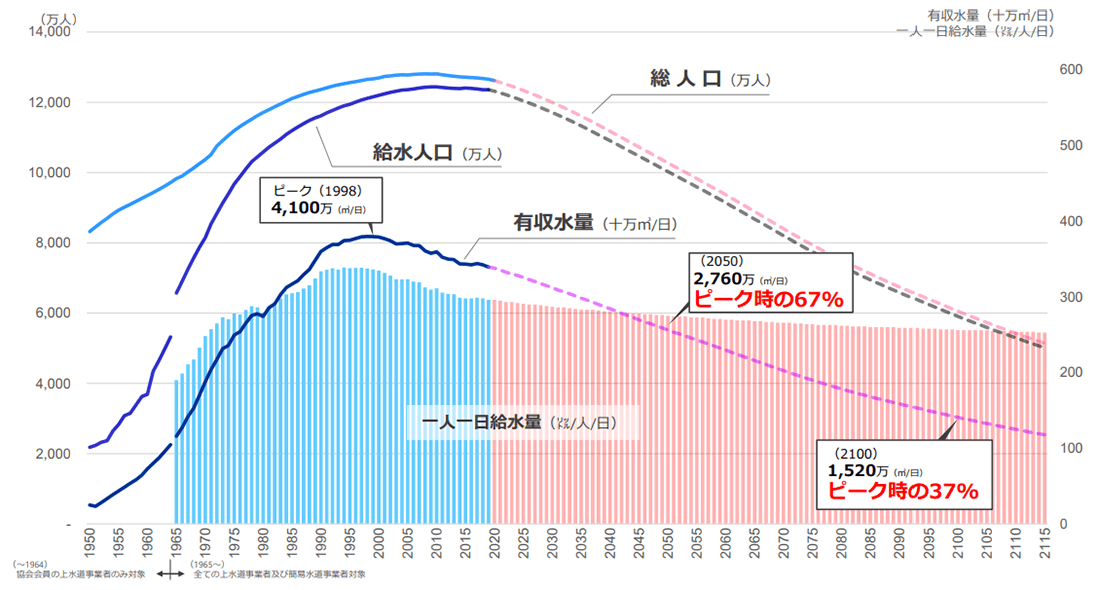 ※2)実績値(~2019):水道統計より。給水人口・有収水量は、上水道及び簡易水道を合わせたものである。総人口のみ2020年まで実績値を記載。一人一日給水量=有収水量÷給水人口。