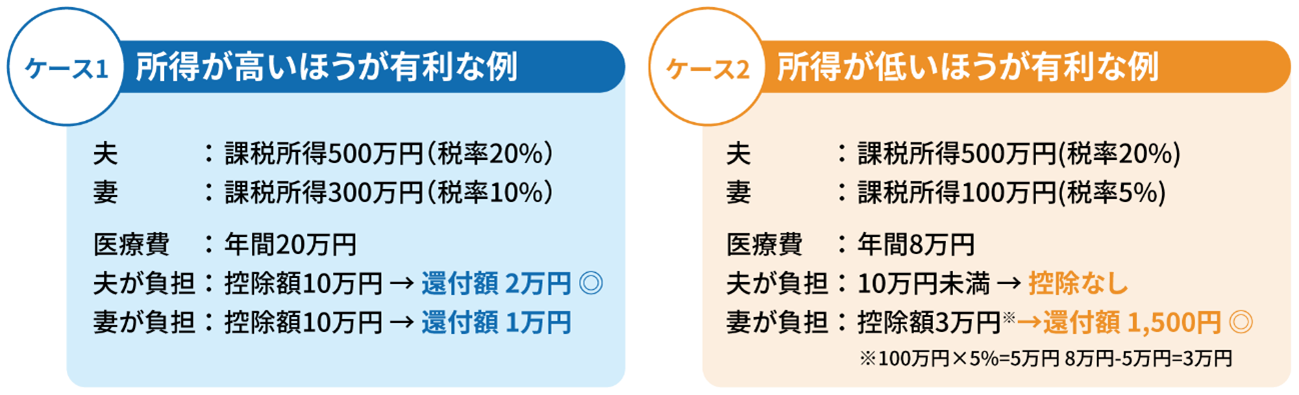 医療費控除は医療費を支払った(負担した)人が申告します。共働き夫婦の場合、控除額は同じでも、課税所得に対する税率が高いほど還付額が増えるため、所得が高い方が医療費を負担すると有利になるケースが多いです。