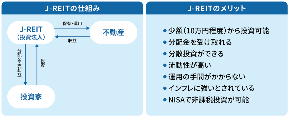 J-REITは、投資家から集めた資金などでオフィスビルや商業施設、物流施設、住宅などの不動産を購入・運用し、賃料収入や売買益を分配して還元する不動産投資信託の一種です。証券会社を通じて売買できます。