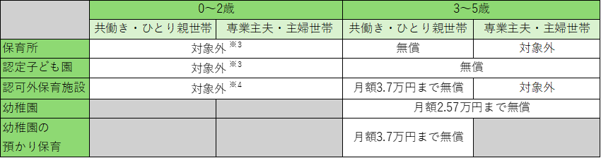 ※2:保育の必要性の認定を受けた場合、認可保育所における保育料の全国平均額(月額3.7万円)までの利用料を無償化