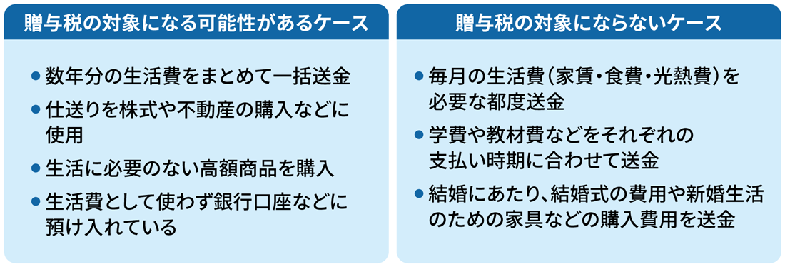 日々の生活や教育にかかる費用を送金する場合、基本的に仕送りが贈与とみなされることはありません。