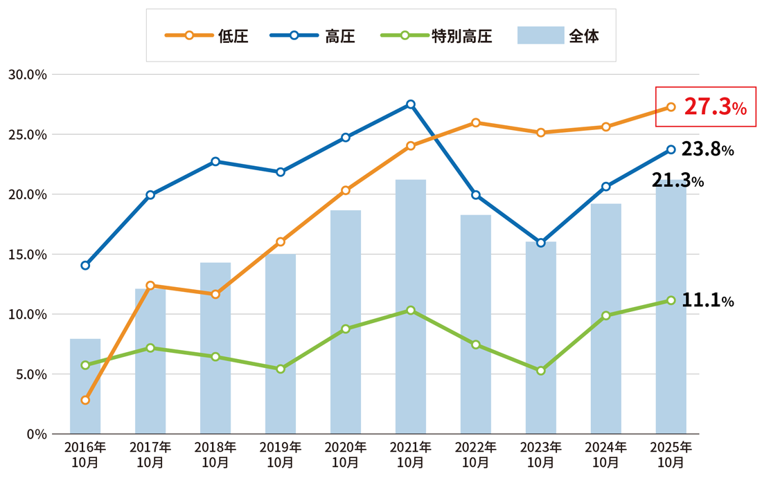 資源エネルギー庁が発表した調査結果によると、家庭等を含む低圧分野では2025年10月時点で新電力のシェアが約27.3%まで達しています。実に4世帯に1世帯は、新電力を利用していることになります。