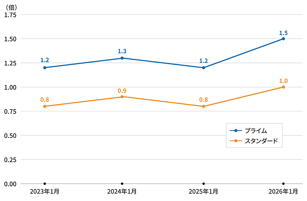 この要請を受け、多くの企業が具体的な改善策を開示しています。その結果、プライム市場上場企業の平均PBRは2026年1月には1.5倍まで上昇しました。スタンダード市場上場企業の平均PBRも2026年1月には平均1倍に達しています。
