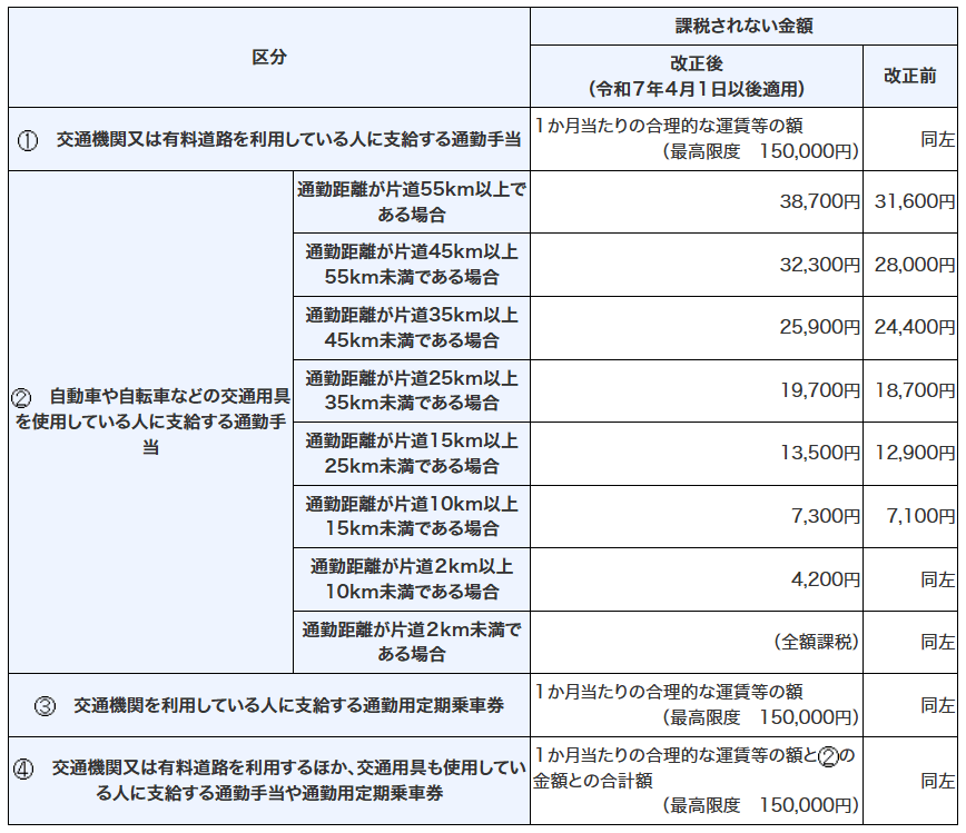 出所:国税庁 令和7年11月「通勤手当の非課税限度額の改正について」